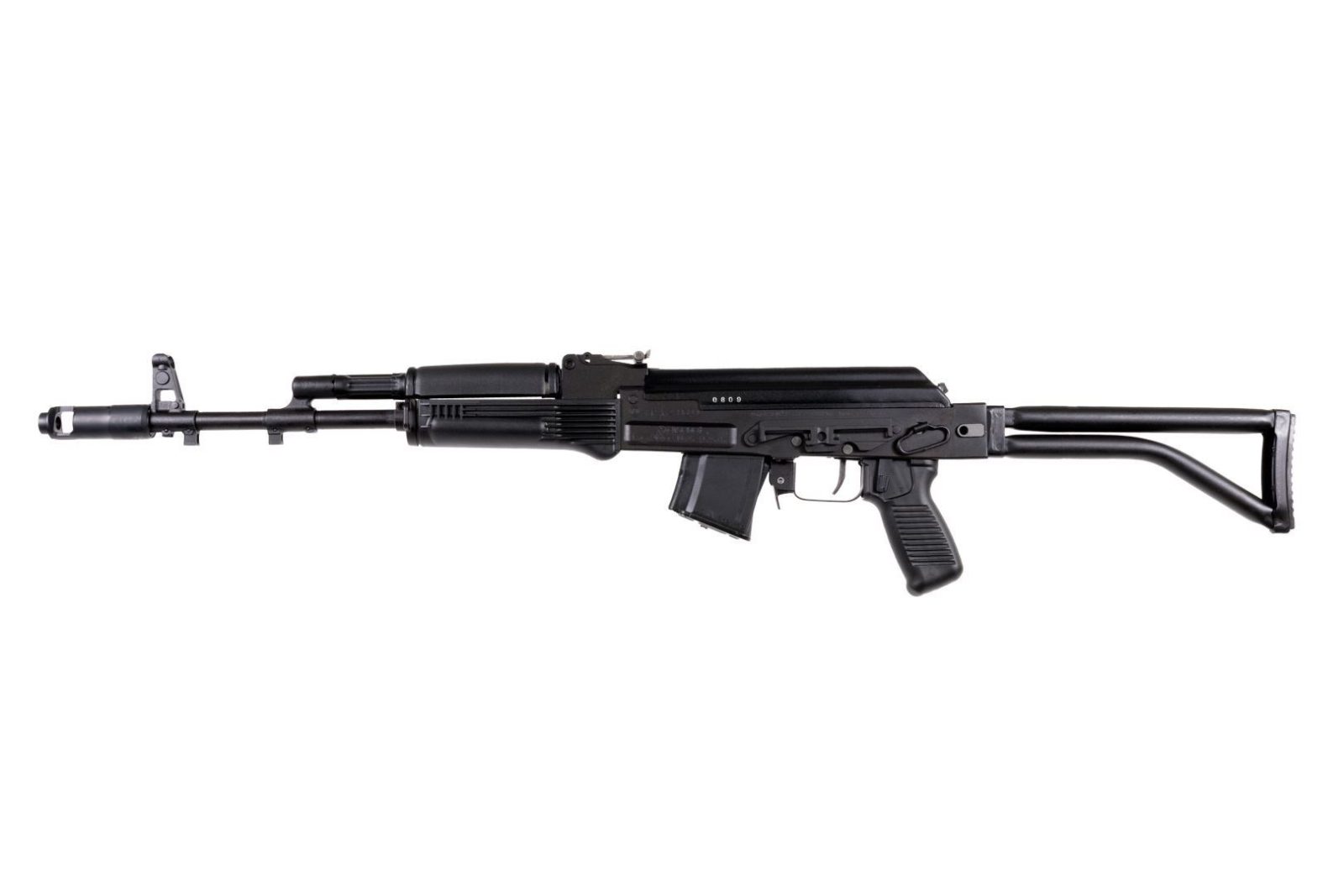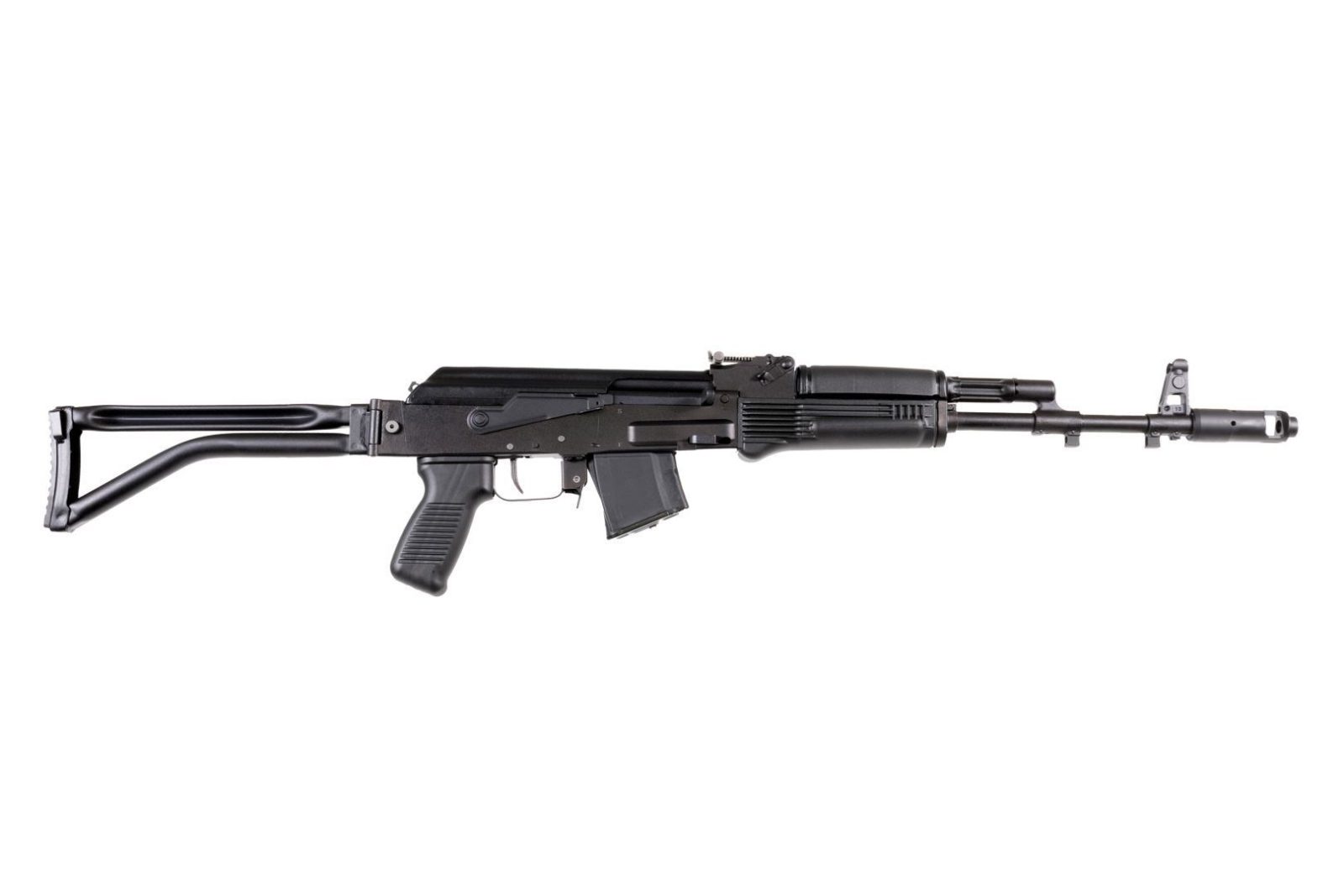 SAM7SF-84B 7.62x39mm caliber rifle milled and forged receiver enhanced FCG chrome lined hammer forged barrel 24×1.5mm muzzle right hand threads muzzle brake bayonet and accessory lugs right-side folding tubular buttstock black polymer pistol grip and handguards stainless steel heat shield ambidextrous safety lever scope rail and one 10-round magazine.