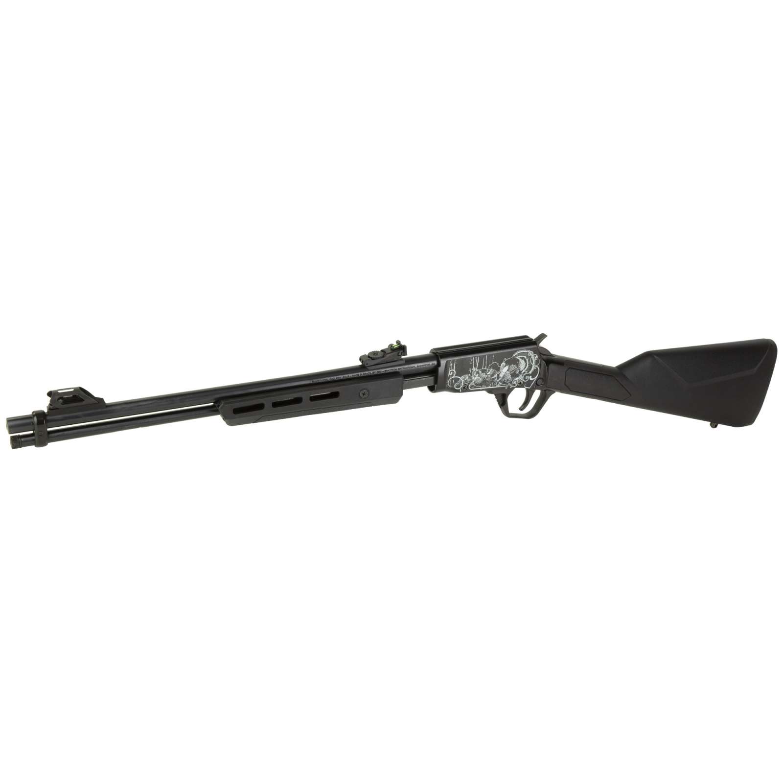 Rossi Gallery, Pump Action Rifle, 22 LR, 18″ Round Barrel, Matte Finish, Black, Synthetic Stock, Adjustable Sights, Black, Laser Engraved Turkey Receiver, 15 Rounds RP22181SY-EN10